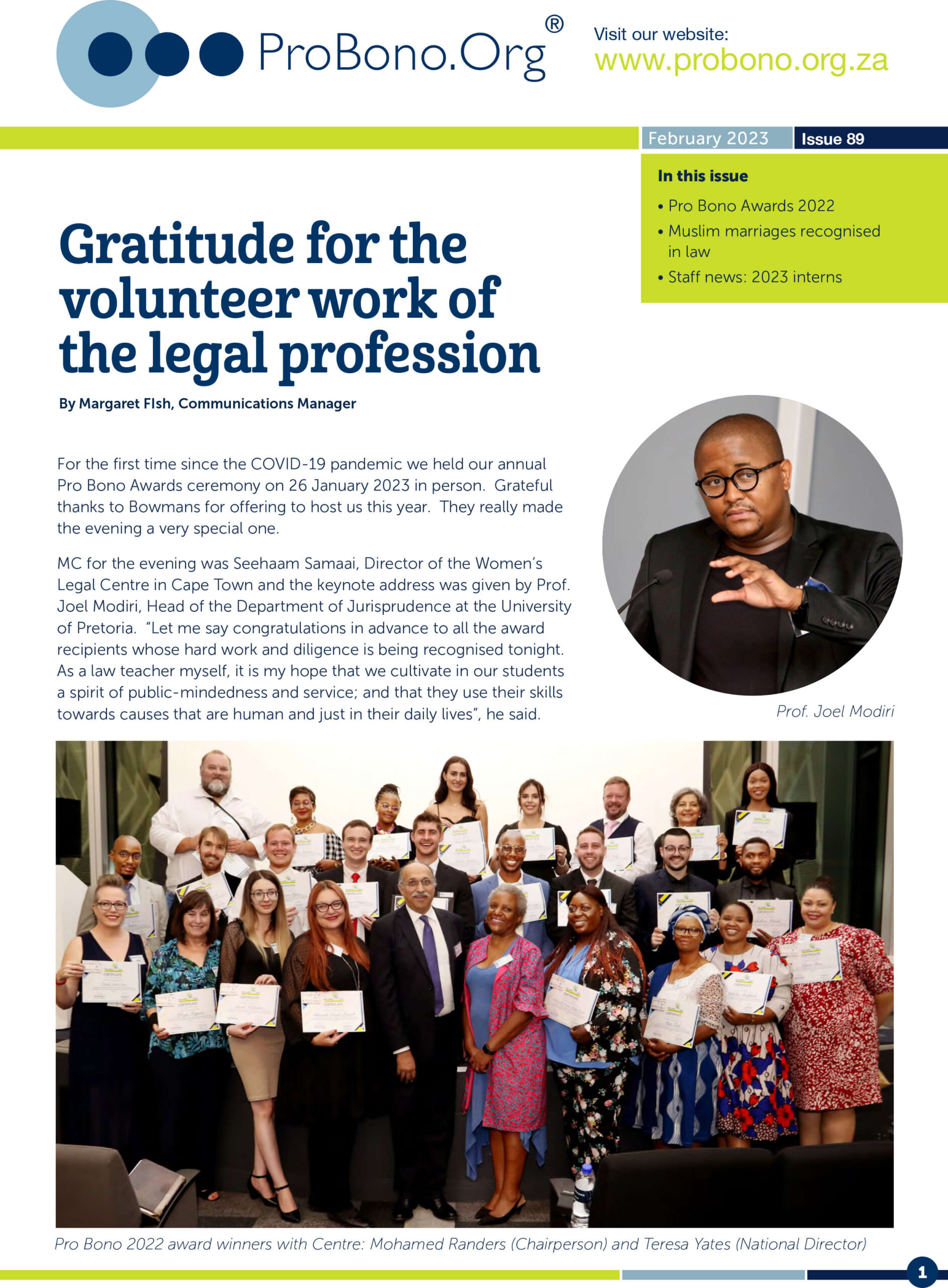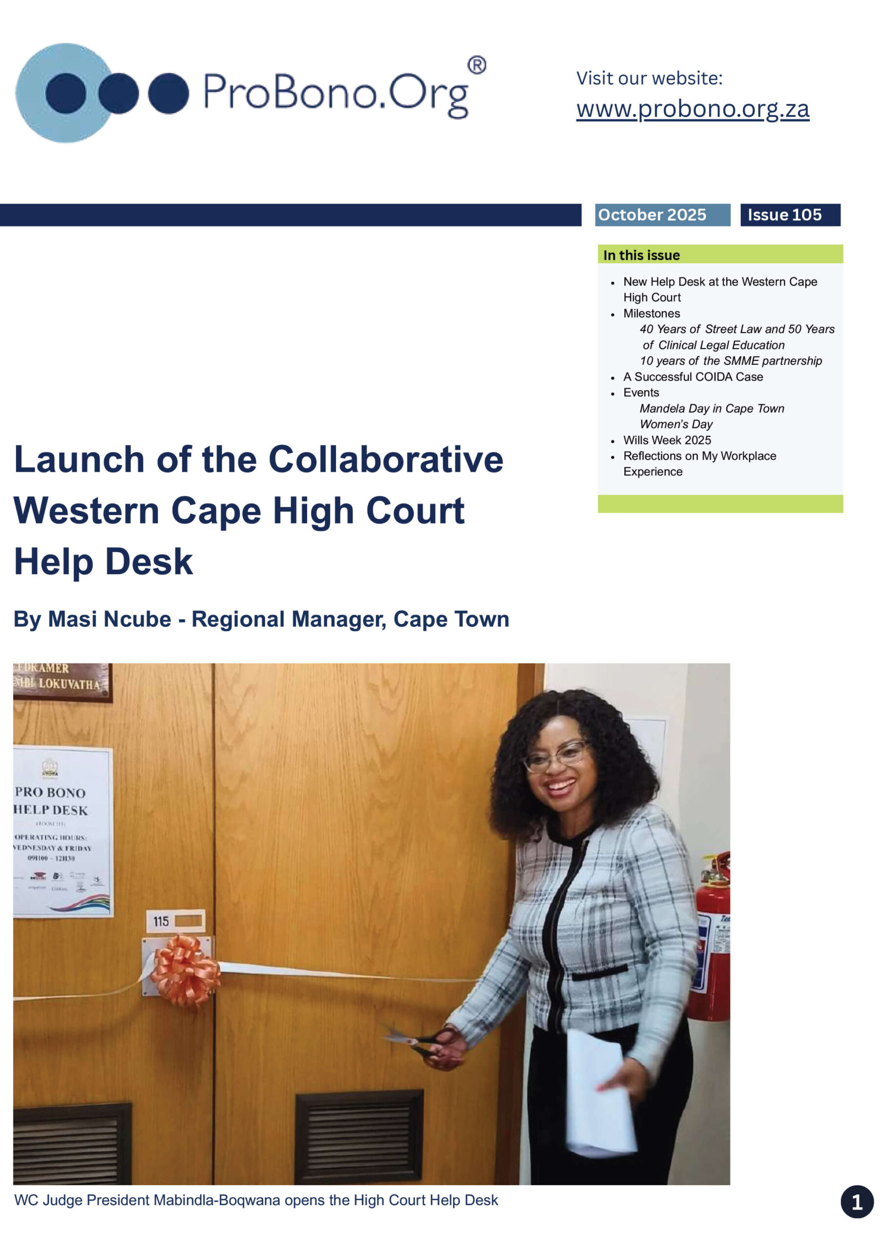 ProBono.Org was founded in 2006 to provide legal assistance to the indigent and vulnerable through operating as a clearing house whereby it finds legal practitioners to take on clients’ civil cases such as divorces, deceased estate disputes, labour matters, etc. This model is unique in South Africa and means that thousands of people can be given advice or have their matters heard in a court of law. The aim of ProBono.Org is to provide access to justice to all who need it.